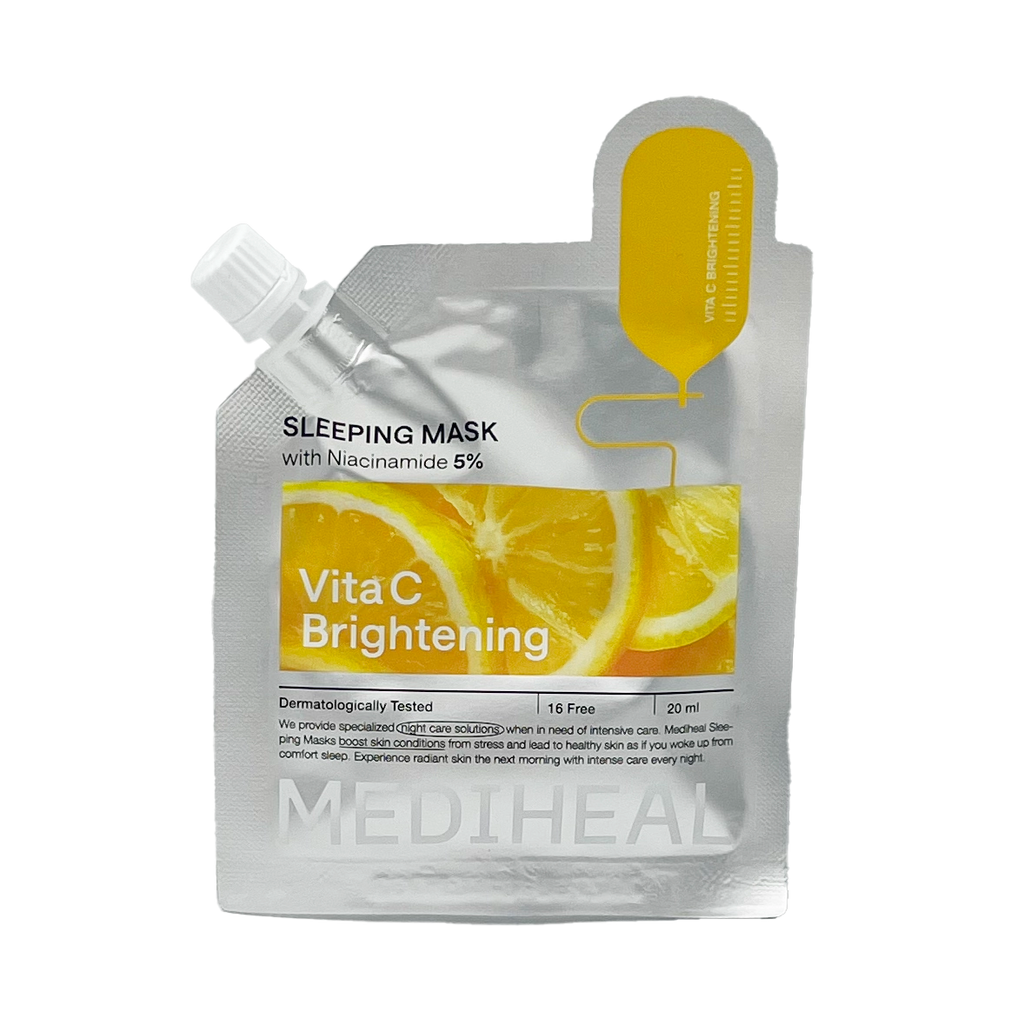 MEDIHEAL Vita C Brightening Sleeping Mask is an overnight mask with a powerful Vitamin C formula that revitalizes the skin with a fresh, moistured glow. Specifically developed for dull and oily skin in need of a refresh, this mask contains 5% niacinamide, Panthenol Active 3X, and PHA/LHA for gentle exfoliation. It also helps to hydrate and smooth out skin texture, while preventing early signs of aging.