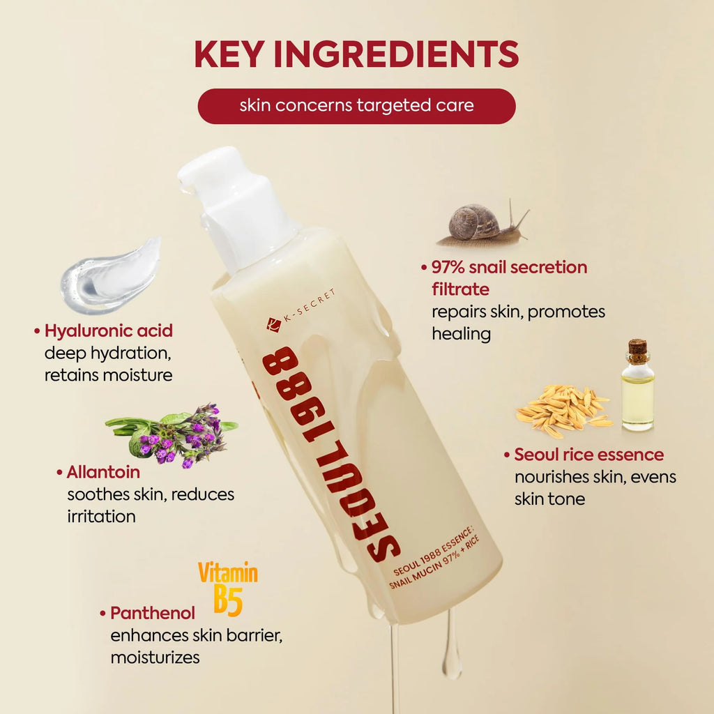 - Introducing K-SECRET SEOUL 1988 97% Snail Mucin Essence Serum: Unlock the Secret of Korean Beauty with our expertly crafted essence, featuring 97% Snail Secretion Filtrate and Rice Ferment Filtrate for transformative effects on skin texture and elasticity. This high-performance serum deeply hydrates and brightens your complexion, revitalizing your skin for a smoother, more radiant, and balanced appearance. Experience the fusion of Korean heritage and modern skincare innovation with K-SECRET 97% Snail Essence!